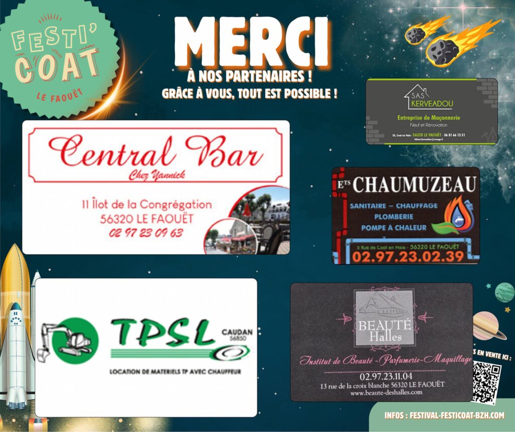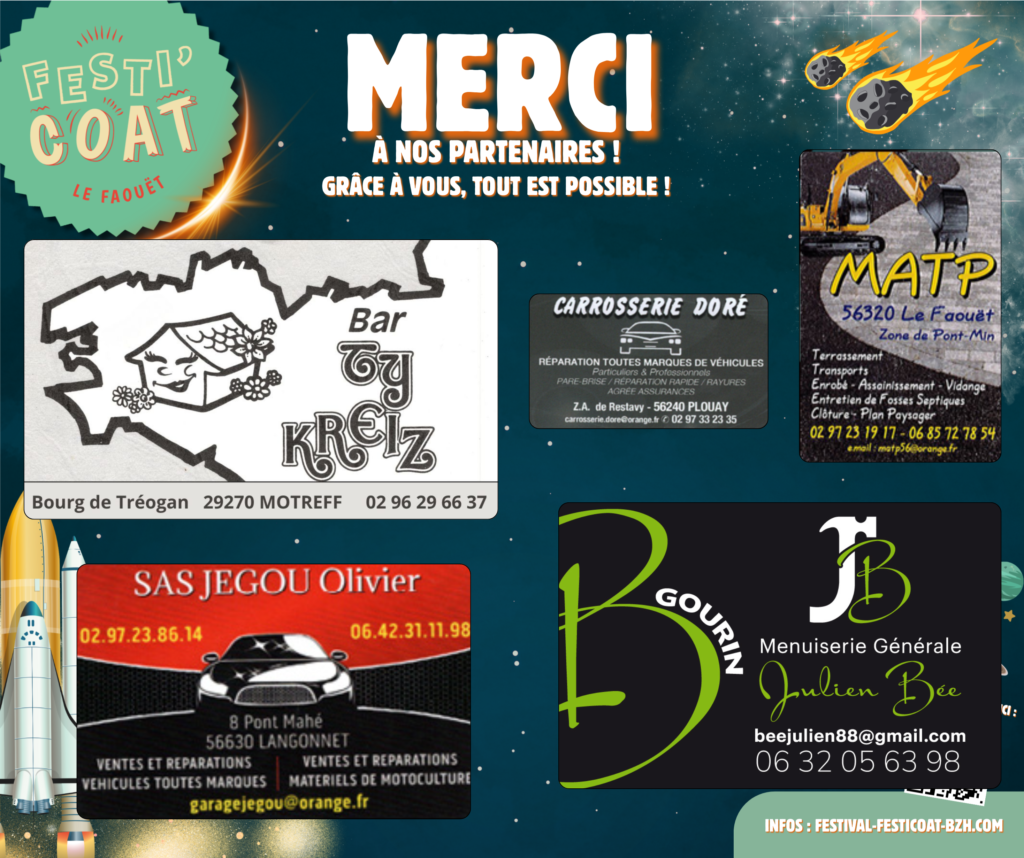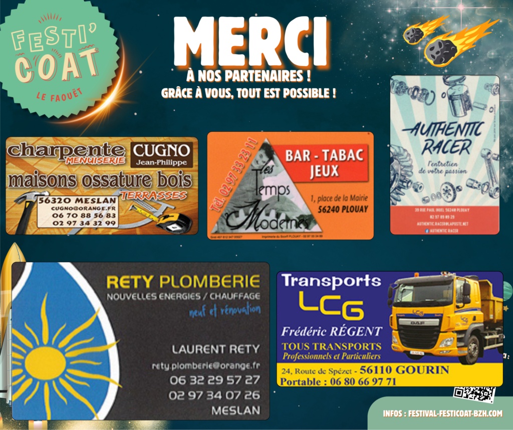 Si vous êtes en quête d’opportunités de communication originales et de nouveaux outils de gestion, tout en souhaitant soutenir un projet local, la collaboration avec le Festi’Coat s’avère cruciale. La participation des entreprises est indispensable pour stimuler de nouvelles idées, projets et initiatives culturelles éducatives, renforçant les liens sociaux dans notre région.